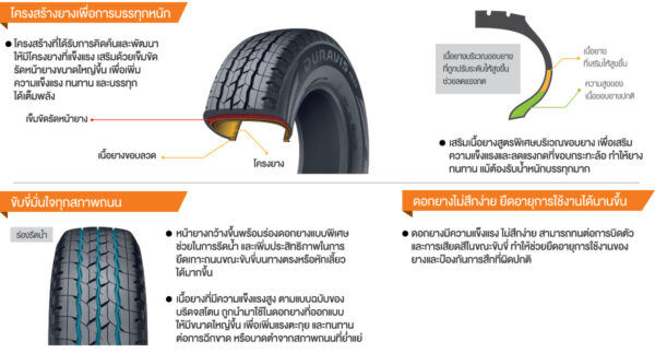 ยางสำหรับรถกระบะเชิงพาณิชย์เพื่องานบรรทุกหนัก โครงสร้างยางเพื่อการบรรทุกหนัก ขับขี่มั่นใจทุกสภาพถนน ดอกยางไม่สึกง่าย ยืดอายุการใช้งานได้นานขึ้น ยี่ห้อ/รุ่นรถยนต์ที่แนะนำ Toyota Hilux Revo, Isuzu D-Max, Isuzu Elf, MG Extender, Mazda BT-50